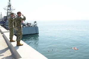 180605-N-SF230-069 MANAMA, Bahrain (June 5, 2018) Vice Adm. Scott A. Stearney, commander, U.S. Naval Forces Central Command/U.S. 5th Fleet/Combined Maritime Forces,, and Capt. Darren B. Guenther, commander, Naval Support Activity (NSA) Bahrain, cast a wreath into the sea as part of a commemoration of the Battle of Midway. This year marks the 76th anniversary of the battle. NSA Bahrain enables the forward operations and responsiveness of U.S., allied, and coalition forces in support of Navy Region Europe, Africa, Southwest Asia's mission to provide services to the Fleet, Fighter, and Family.