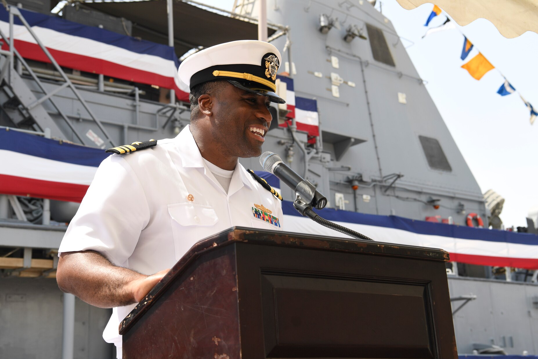 180711-N-TB177-1055 MANAMA, Bahrain (July 11, 2018) Lt. Cmdr. Roosevelt White gives remarks during a change of command ceremony for the Avenger-class mine countermeasures ship USS Gladiator (MCM 11) at Naval Support Activity Bahrain. Gladiator is forward deployed to the U.S. 5th Fleet area of operations in support of naval operations to ensure maritime stability and security in the Central region, connecting the Mediterranean and the Pacific through the western Indian Ocean and three strategic choke points.