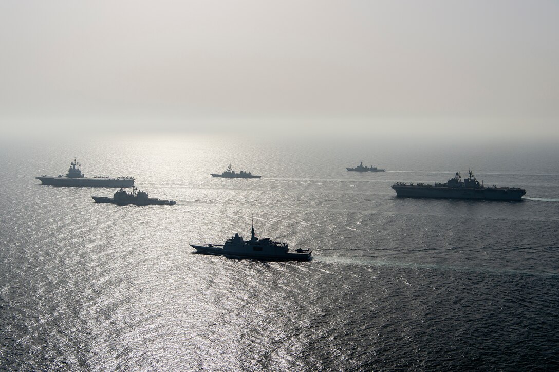 During the French carrier strike group mission CLEMENCEAU 21, exercise GASWEX (Group Arabian Sea Warfare Exercise) brings together American, Belgian, French and Japanese naval assets, in a combined, multilateral surface, air and sub-surface training. Around french aircraft carrier Charles de Gaulle appear the US guided-missile cruiser Port Royal and the US amphibious assault ship Makin Island, the Belgian frigate Leopold the 1st, the Japanese destroyer Ariake, and the French frigate Provence. GASWEX exercise aims is to improve operational effectiveness and enhance interoperability between partners. © Marine nationale / Défense Au cours de la mission CLEMENCEAU 21 le groupe aéronaval Task Force 473, qui a organisé l’exercice GASWEX,a rassemblé lors d’un PHOTEX l’ensemble des bâtiments participants : le porte-avions Charles de Gaulle, la frégate multi-missions (FREMM) Provence, le porte-hélicoptères américain USS Makin Island, la frégate américaine USS Port Royal, la frégate belge BNS Léopold 1er et la frégate japonaise JS Ariake. Le vendredi 19 mars 2021, en mer d’Arabie. Le groupe aéronaval (GAN) multinational constitué autour du porte-avions français Charles de Gaulle forme la Task Force 473, placée sous le commandement du contre-amiral (CA) Marc Aussedat. Baptisée CLEMENCEAU 21, cette mission opérationnelle conduit le GAN en Méditerranée, au nord de l’océan Indien (mer d’Arabie) et dans le Golfe arabo-persique de février à juin 2021. La mission CLEMENCEAU 21 est composée de plusieurs phases. La deuxième phase initiale en mer Rouge, océan Indien et Golfe arabo-persique permet aux escorteurs français Frégate de défense aérienne (FDA) Chevalier Paul, Frégate multi-missions (FREMM) Provence, Bâtiment de commandement et de ravitaillement (BCR) Var et allié (frégate belge Léopold 1er) d’assurer la présence française dans des zones stratégiques, de contribuer à l’appréciation autonome de situation et de lutter contre le terrorisme isl
