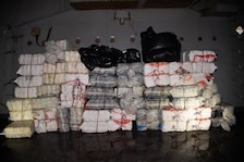 220516-N-TT059-1008 GULF OF OMAN (May 16, 2022) Bags of illegal narcotics are stacked aboard guided-missile destroyer USS Momsen (DDG 92), May 16, after being seized from a fishing vessel in the Gulf of Oman.