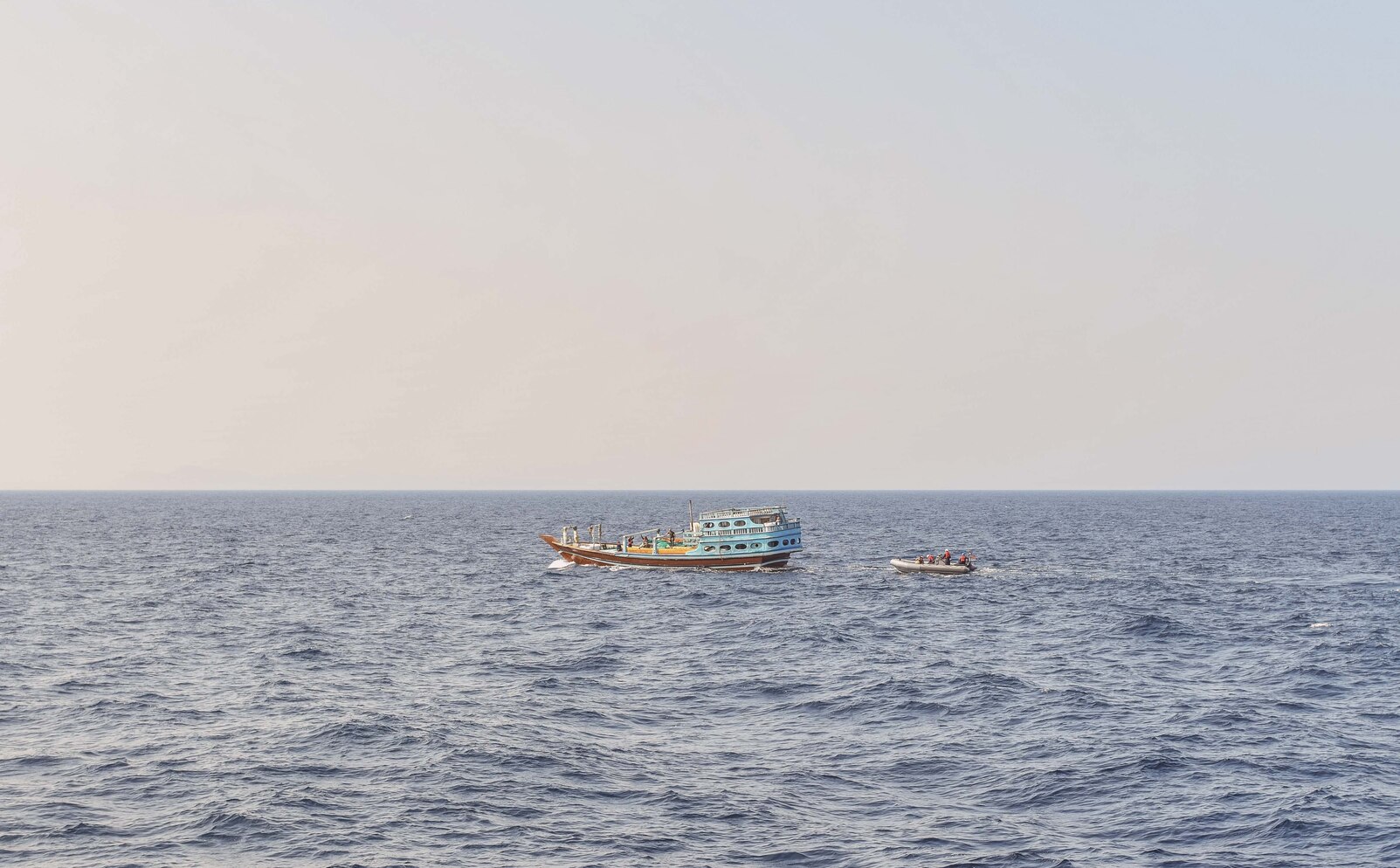 GULF OF OMAN (Nov. 8, 2022) U.S. naval forces approach a fishing vessel transiting international waters in the Gulf of Oman, Nov. 8, during an interdiction.