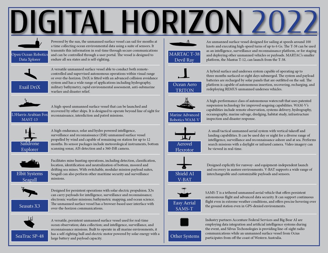 221123-A-RY768-1001 MANAMA, Bahrain (Nov. 23, 2022) Graphic illustration depicting the unmanned systems that will participate in exercise Digital Horizon 2022. The three-week unmanned and artificial intelligence integration event, beginning Nov. 23, will involve employing new platforms in the region for the first time. (U.S. Army graphic by Sgt. Brandon Murphy)