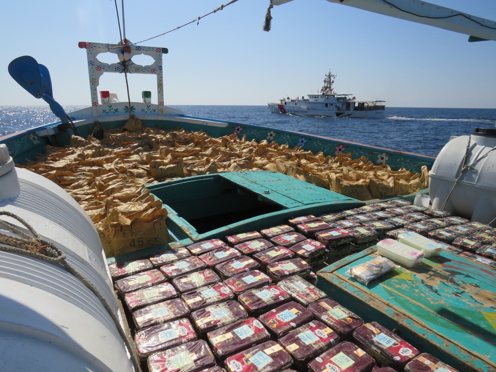 230130-N-NO146-1001 GULF OF OMAN (Jan. 30, 2023) Illicit drugs interdicted by USCGC Emlen Tunnell (WPC 1145) sit on the deck of a fishing vessel for inventory as the U.S. Coast Guard cutter sails in the Gulf of Oman, Jan. 30. (U.S. Coast Guard photo)