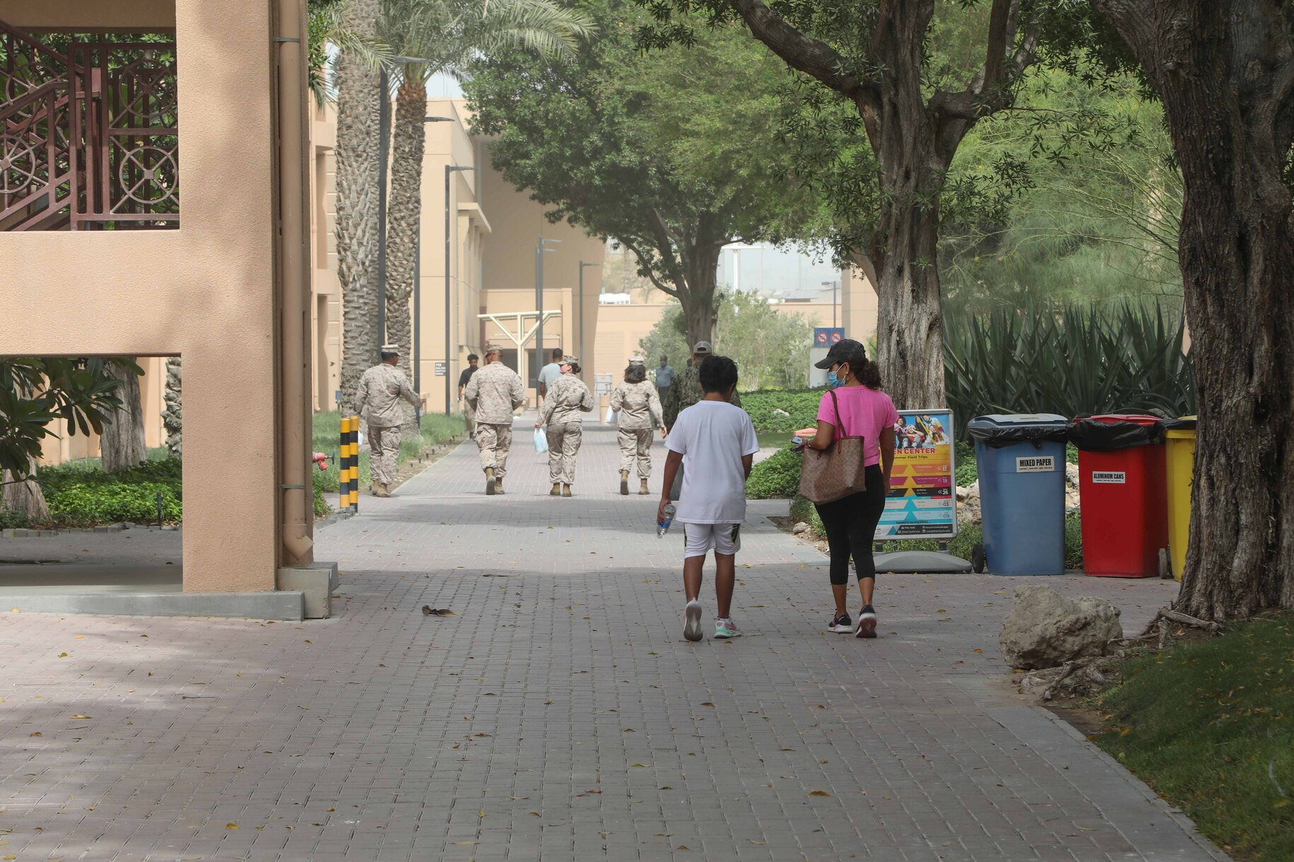 MANAMA, Bahrain (May 31, 2023) Family and service members walk outdoors at the U.S. Navy base in Manama, Bahrain, May 31, 2023.