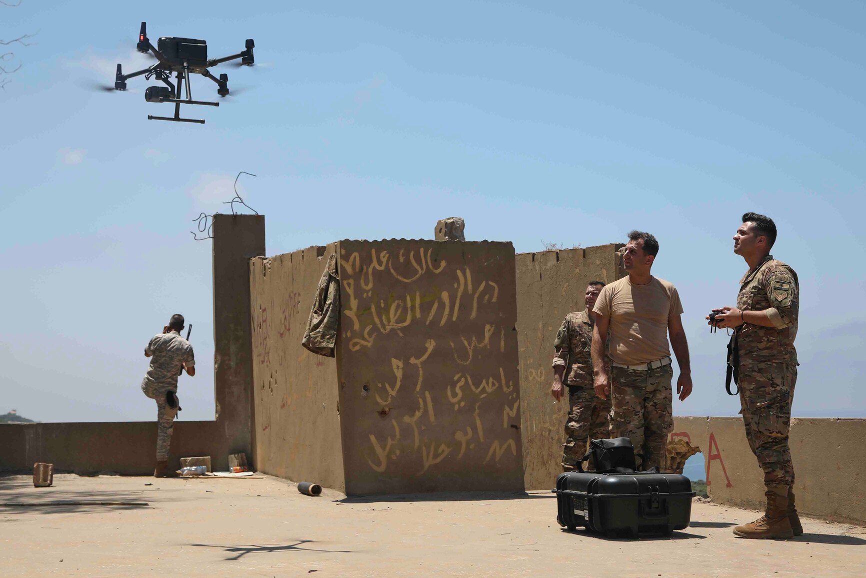 230717-A-CY959-1109 AMCHIT, Lebanon (July 17, 2023) U.S. service members and personnel from the Lebanese Armed Forces operate an unmanned aerial vehicle during exercise Resolute Union 2023 in Amchit, Lebanon, July 17, 2023. Resolute Union is an annual exercise between U.S. 5th Fleet and partner nations to enhance security cooperation.