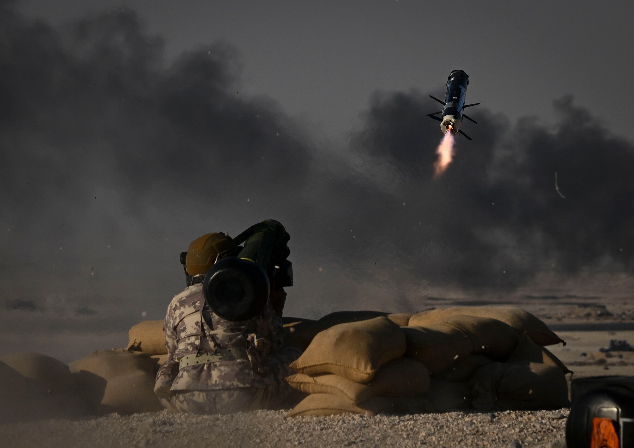 A member of the Qatar military fires a Javelin shoulder-fired anti-tank missile during the exercise Ferocious Falcon live-fire demonstration within the U.S. Central Command area of responsibility, Nov. 20, 2025. Ferocious Falcon 6 is a biennial, Qatar-hosted multinational joint exercise designed to enhance lethality and combat efficiency among U.S. and allied forces. (U.S. Air Force photo by Senior Master Sgt. Richard P. Ebensberger)